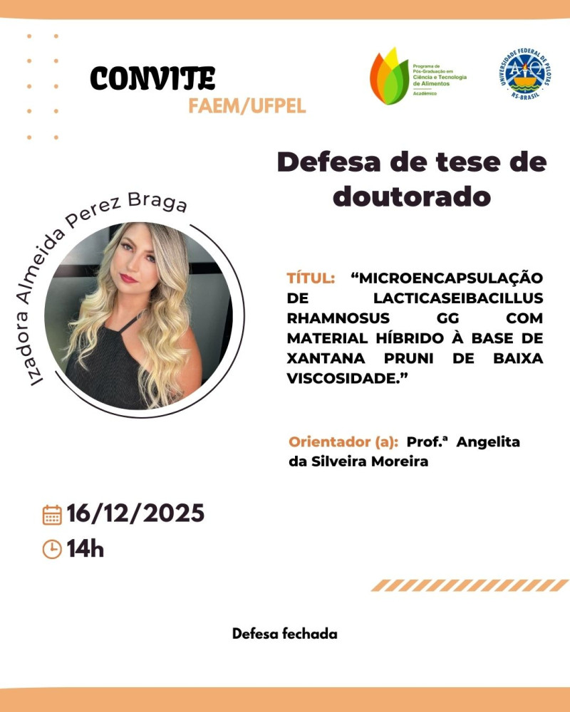 Convidamos a todos para a Defesa de Tese de Doutorado da discente Izadora Almeida Perez Braga.