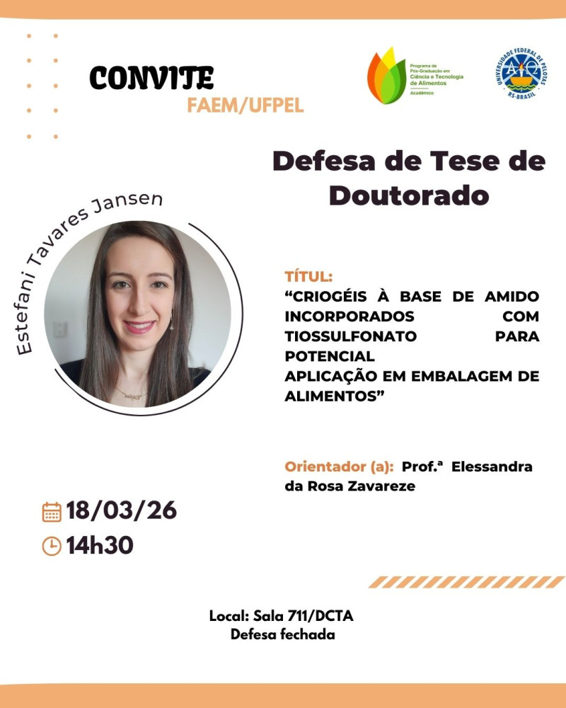 Convidamos a todos para a Defesa de Tese de Doutorado da discente Estefani Tavares Jansen.