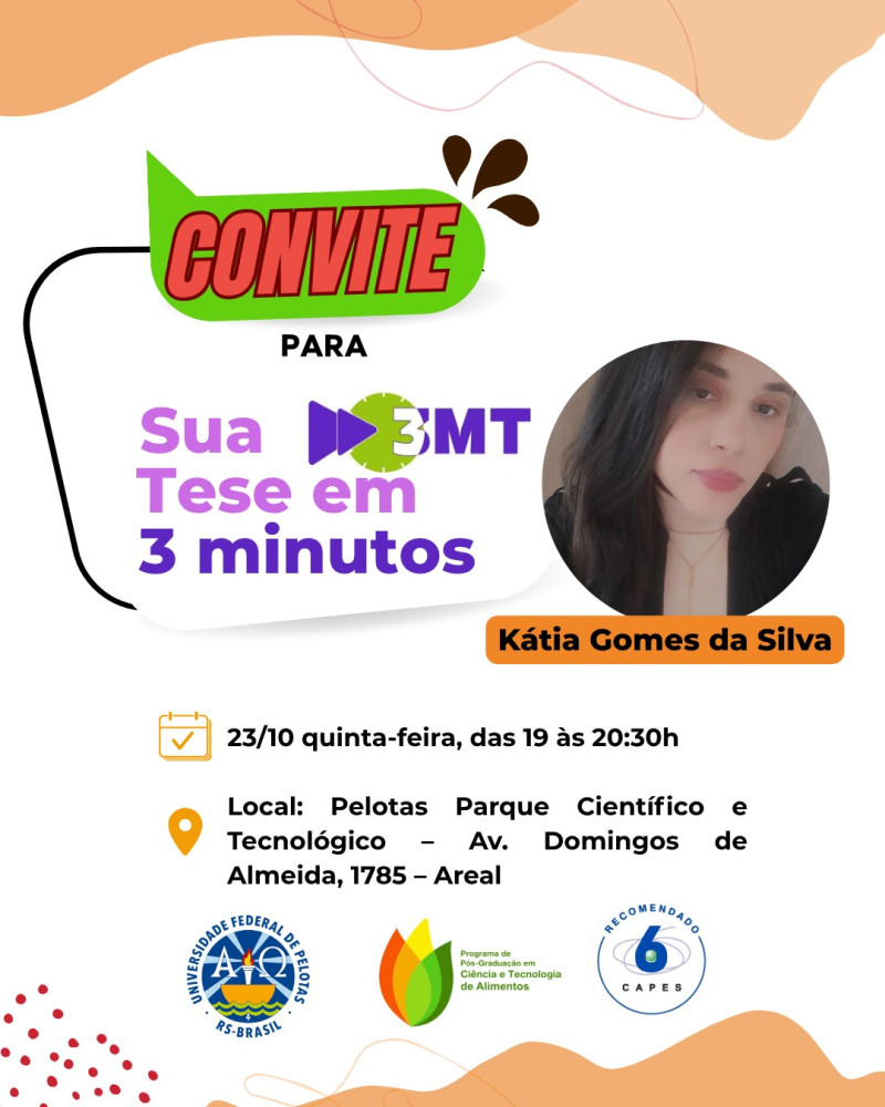 O PPGCTA convida a comunidade para assistir a apresentação da doutoranda Kátia Gomes da Silva no evento Sua Tese em 3 Minutos, que ocorrerá no dia 23/10.