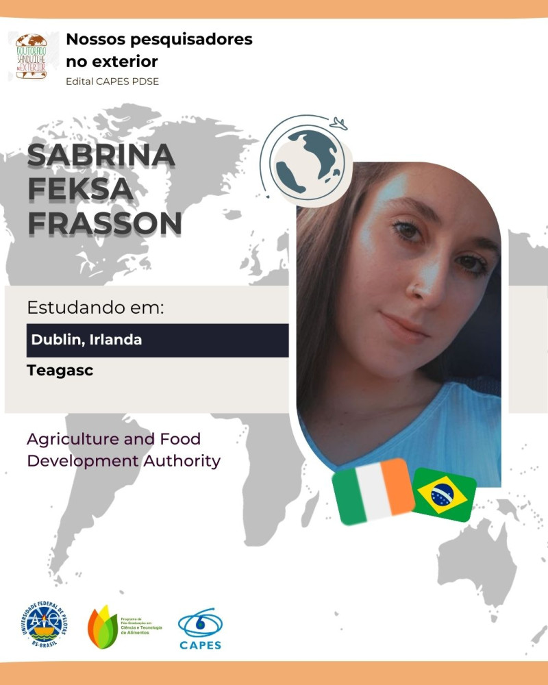 A doutoranda do PPGCTA Sabrina Feksa Frasson esta desenvolvendo parte de sua pesquisa na Teagasc - Agriculture and Food Development Authority em Dublin, Irlanda. A experiência acontece por meio do edital Capes PDSE.