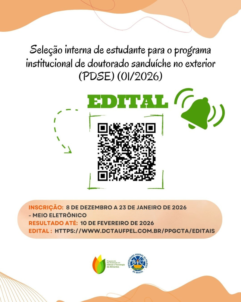 Confira o edital de Seleção interna do PPGCTA para o Programa Institucional de Doutorado Sanduíche no Exterior (PDSE).